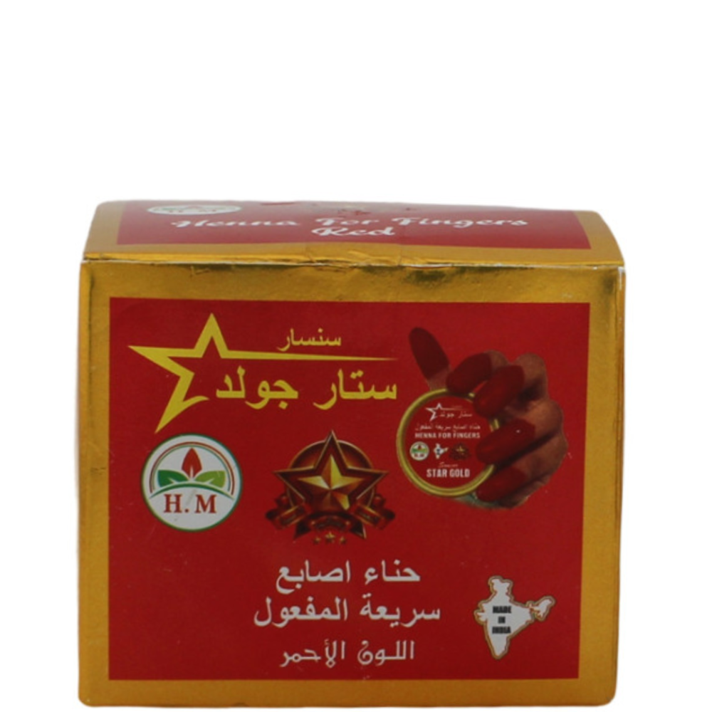 النجمة الذهبية حناء أصابع سريعة المفعول - لون احمر هو الاختيار المثالي للحصول على لون طبيعي وثابت بسهولة وسرعة. اجعليه جزءًا من روتين جمالك وتمتعي بإطلالة مميزة!